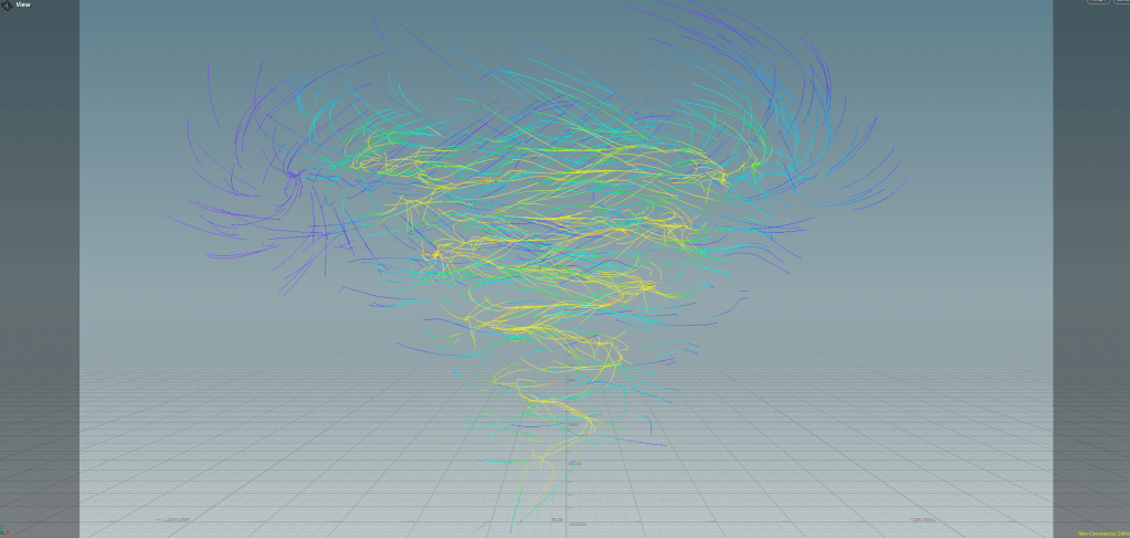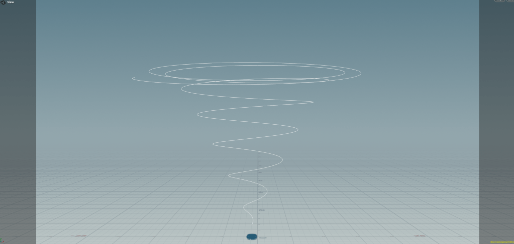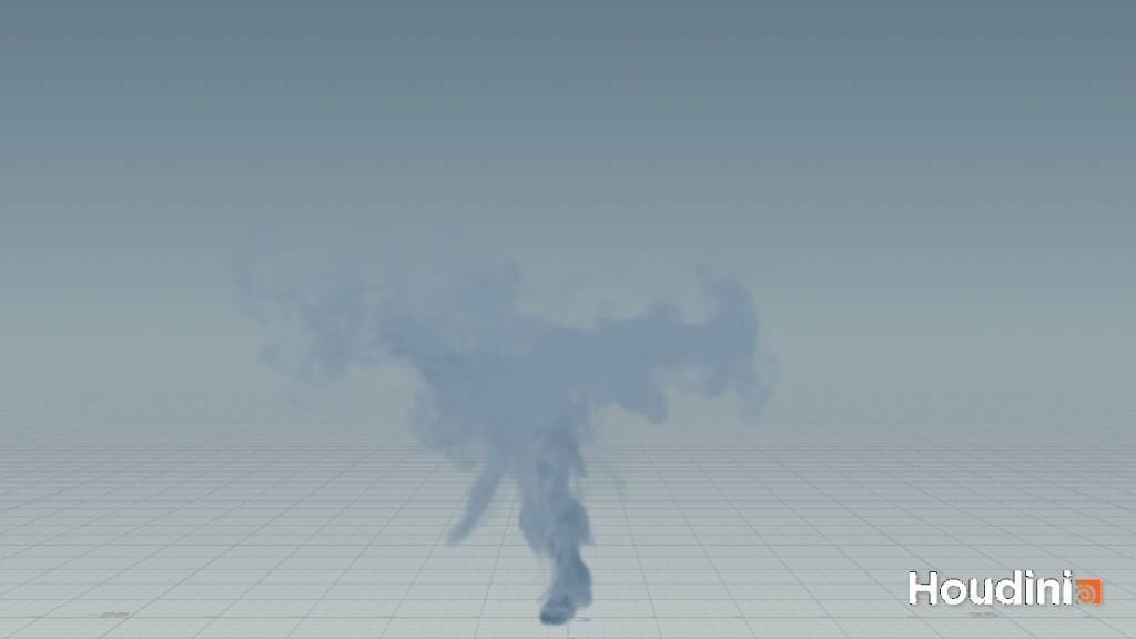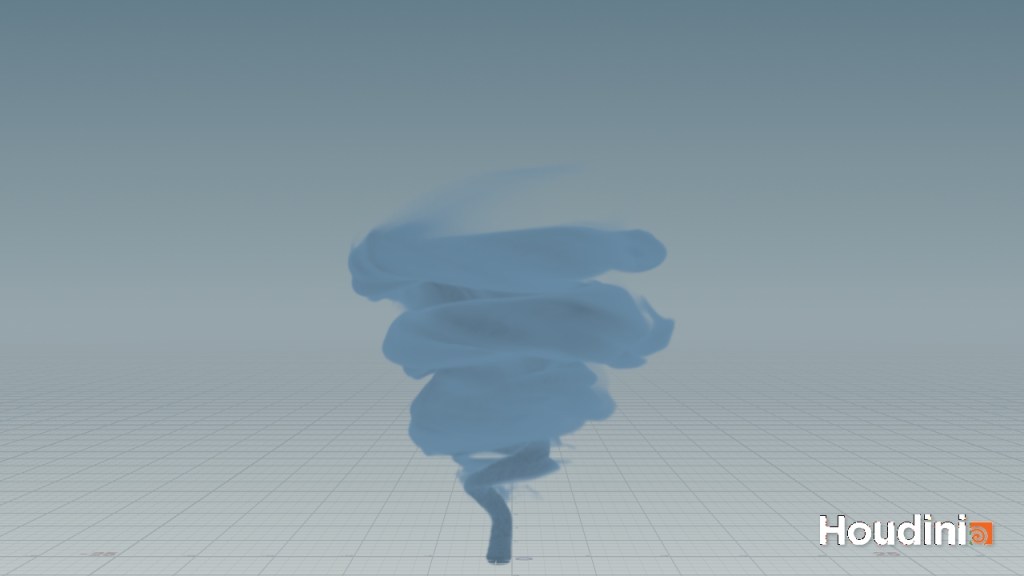 The path is a simple spiral that starts narrow and widens as it rises. While also the vertical rise exponentially slows. We used a force along paths node to make the smoke adhere along the path. This allowed us to create the original smoke sim. Secondly we added forces within the pyro node itself to move the smoke more dynamically along this path.